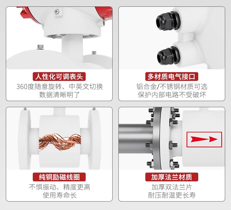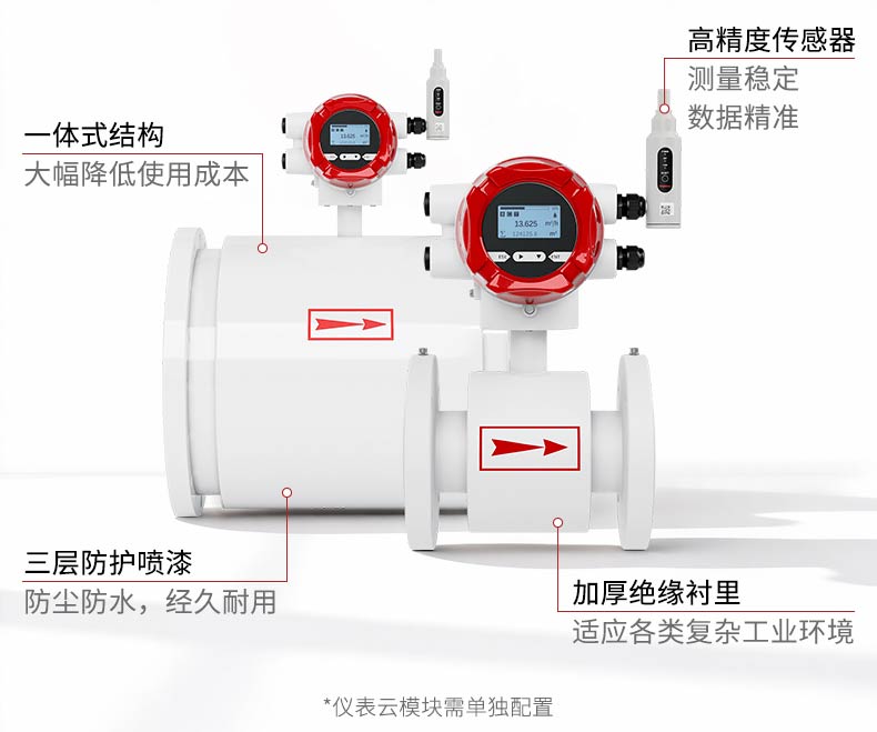 产品描述:电磁流量计基于法拉第电磁感应原理设计,用于直接测量封闭管道内导电液体的瞬时流量,并具有流量累积功能。在进行现场监测显示的同时,可输出标准的电流信号、脉冲信号和 RS485 数字信号,供记录、调节、控制使用,实现检测自动控制。可广泛应用于自来水、化工、煤炭、环保、轻纺、冶金、造纸等行业。