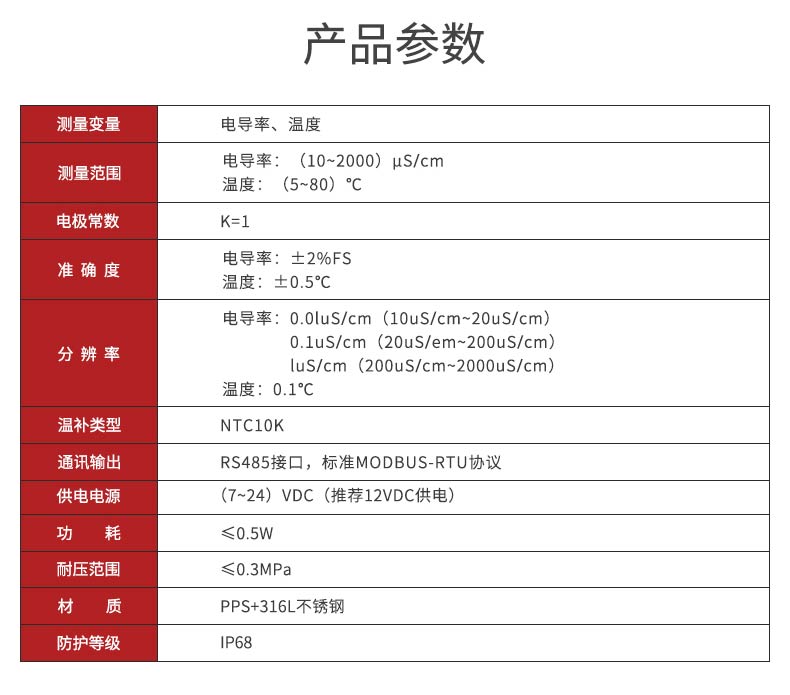 产品描述:电导率数字式电极采用 RS485 通讯接口和 Modbus RTU标准协议的数字式电导率传感器,可同时测量电导率和温度参数。本产品广泛应用于生活用水、生活污水、江河湖泊、自来水、市政污水、地表水、循环冷却水、软化水、二次供水、泳池等场合水质监测。