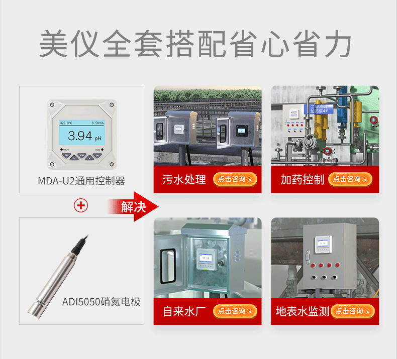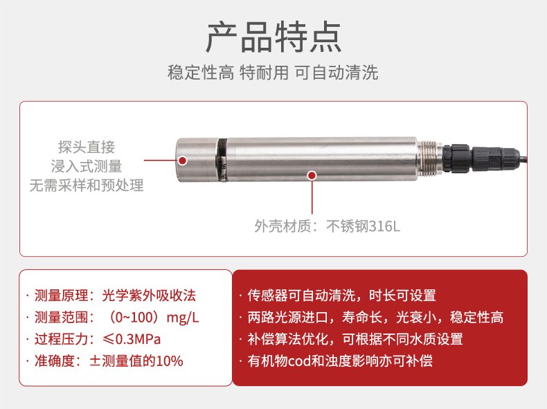 产品描述:ADI5050款硝氮电极是基于紫外光吸收法测量,一种利用紫外光谱分析技术,直接、快速、准确地测量水体中硝态氮,(NO3-N)浓度的先进在线监测设备。通过校正公式消除有机物干扰,最终根据朗伯-比尔定律将计算出的净吸光度值实时转换为硝酸盐氮(NO3-N)的浓度值,并通过数字信号输出。