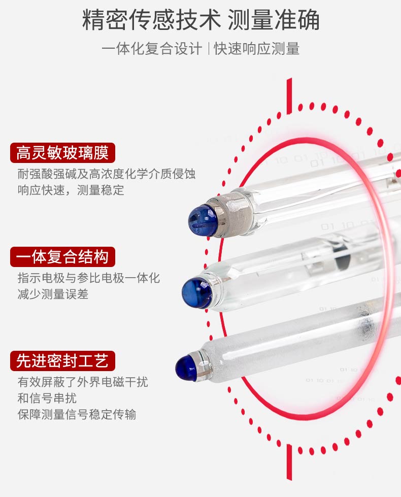 产品描述:pH 玻璃电极是由玻璃指示电极和银/氯化银参比电极组合在一起的复合电极,作为 pH 值测量传感器广泛应用于测量水溶液中的 pH 值。使用场景:自来水、地表水、综合废水等。