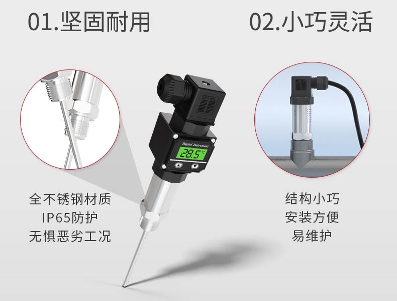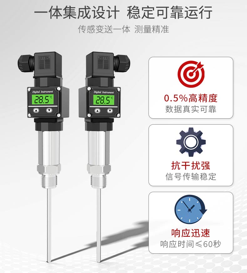 产品描述:本温度变送器采用 Pt100 温度传感器作为敏感元件,与信号转换放大单元结合为一体,用来测量各种工艺过程中液体的温度。本产品使用高稳定性的电路进行信号处理,实现温度连续测量和输出,采用高精度 24 位 ADC 转换为数字信号,同时可以实现显示、远传等功能。广泛应用于石油、化工、电力、轻纺、环保等领域中对水或油的温度测量。