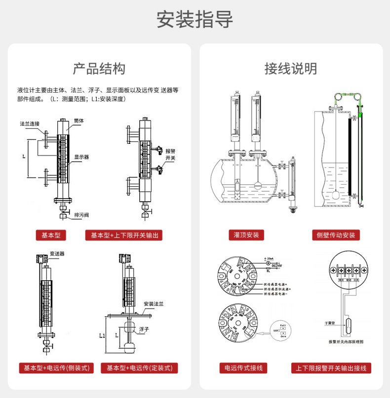 产品描述:磁翻板液位计根据浮力原理,实现液位的指示,并且在液位计的主体上安装变送器,可以实现远传显示。适用于低温到高温、真空到高压等各种环境,是石油化工等行业理想的液位测量产品。